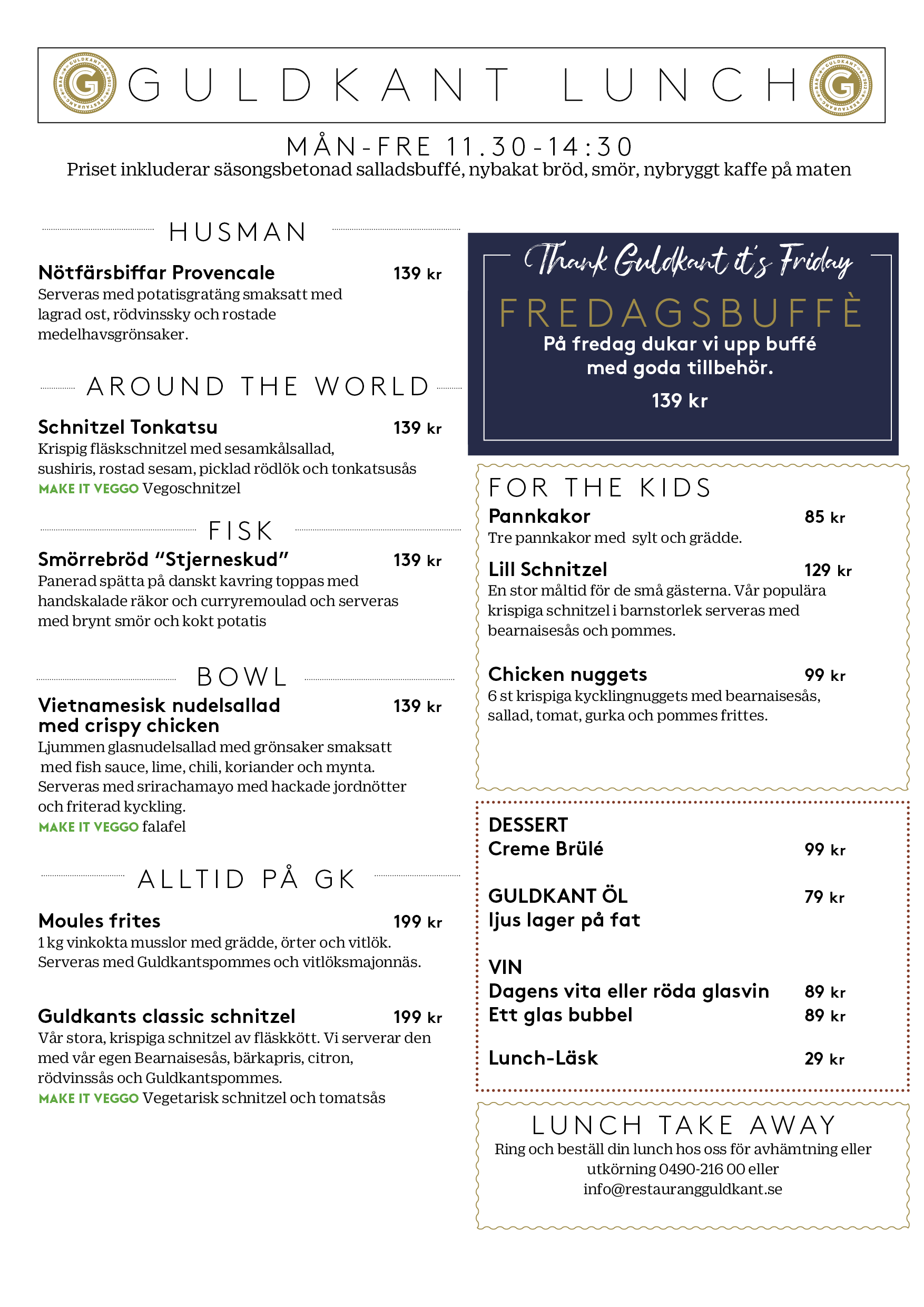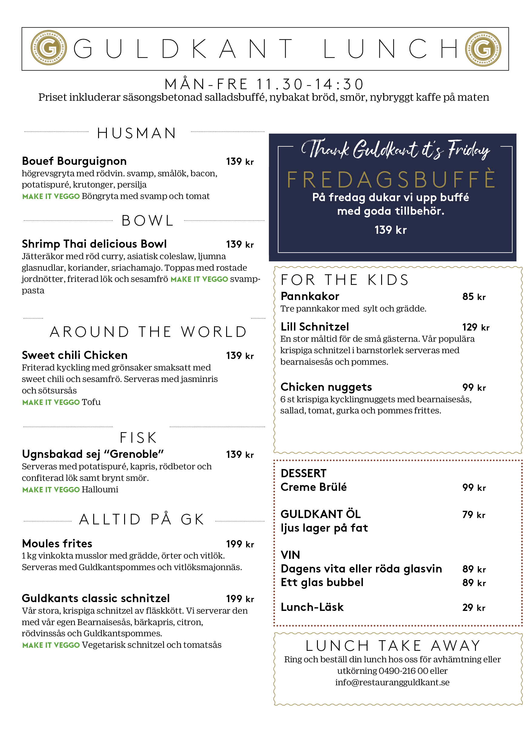 GULDKANT är en restaurang och bar. Här äter du lunch eller en god middag från vår kvällsmeny. I vår bar möter du upp dina vänner för något gott att dricka eller njuter av en krämig latte bland sköna soffor och fåtöljer. Vi hjälper dig gärna med mat för avhämtning eller catering.